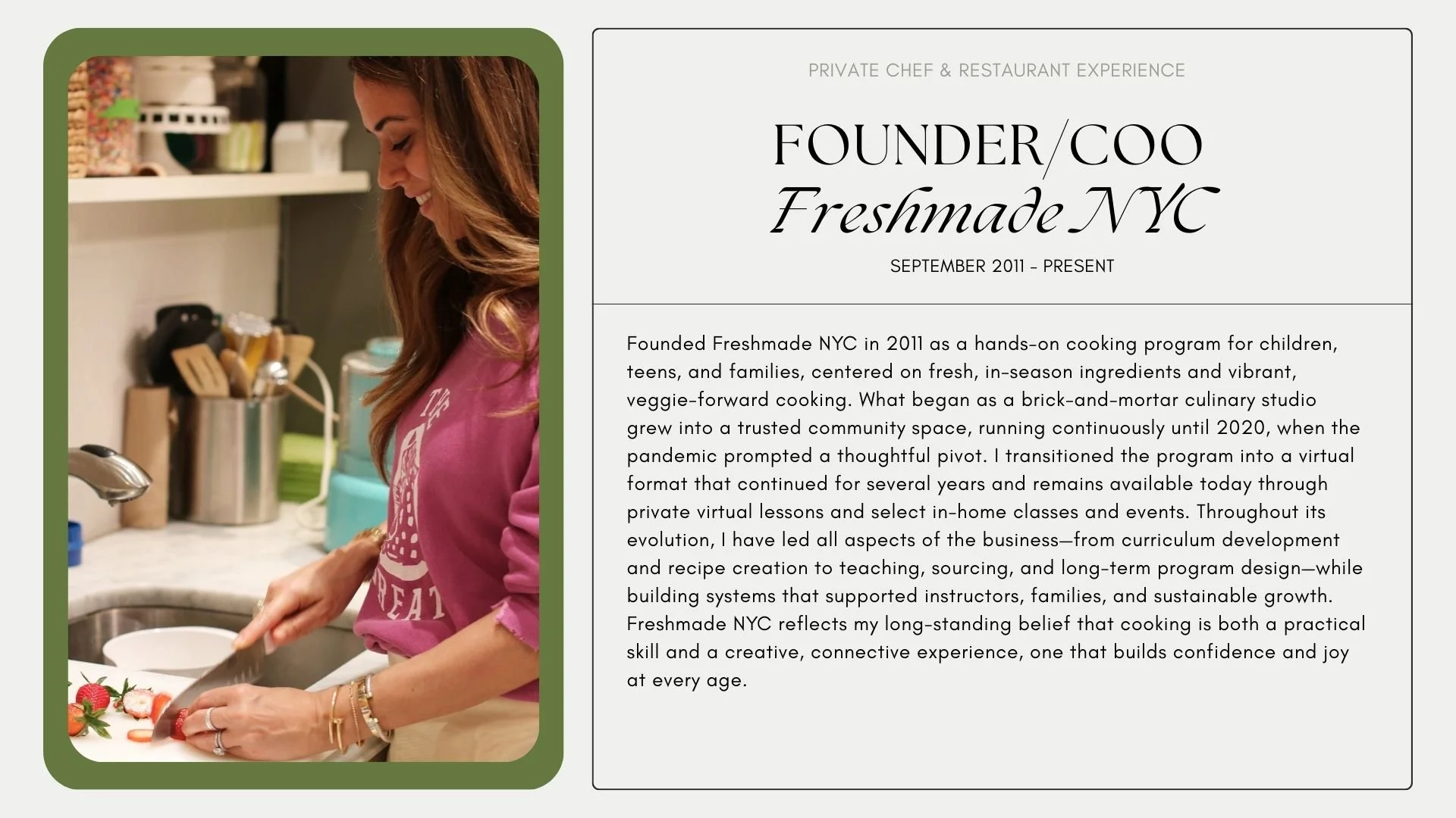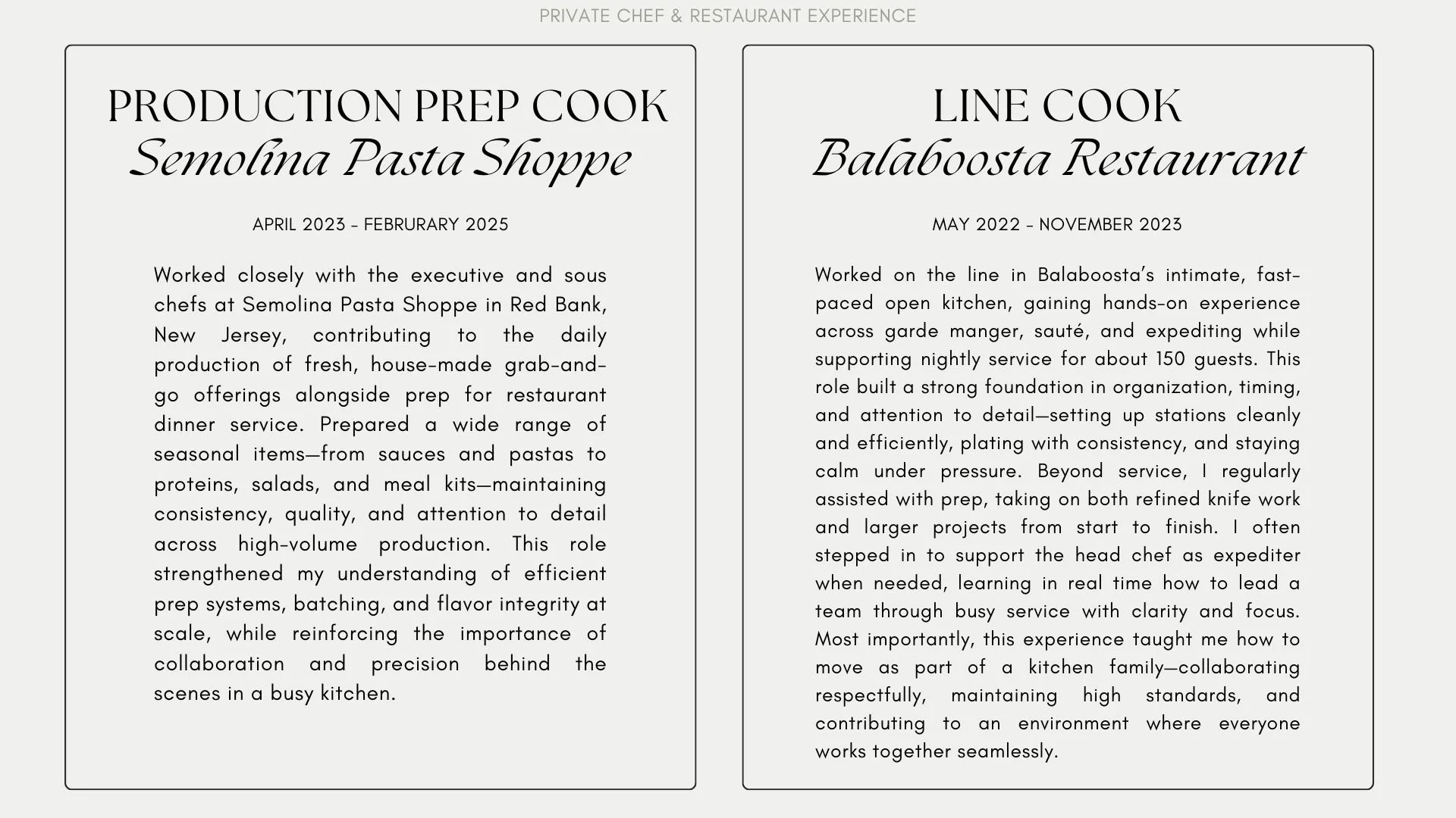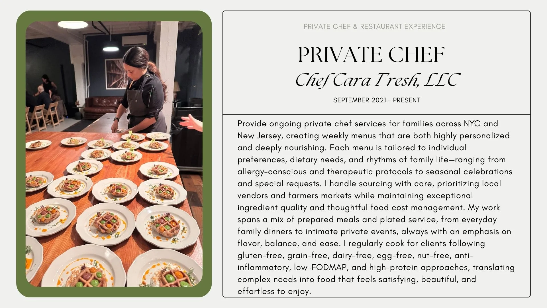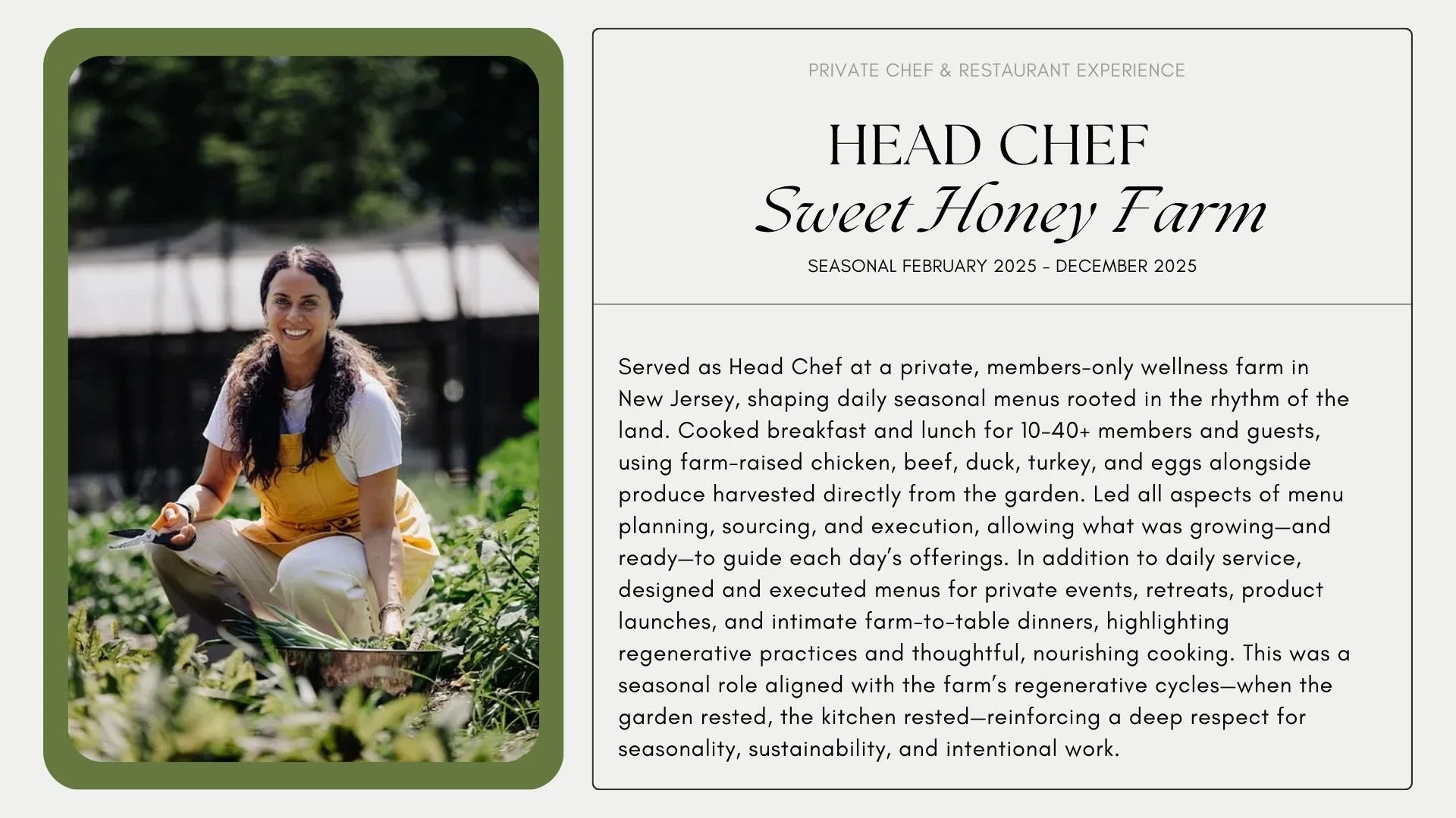 My background spans private homes, wellness-focused environments, restaurants, and culinary education—each shaping how I cook and work today.