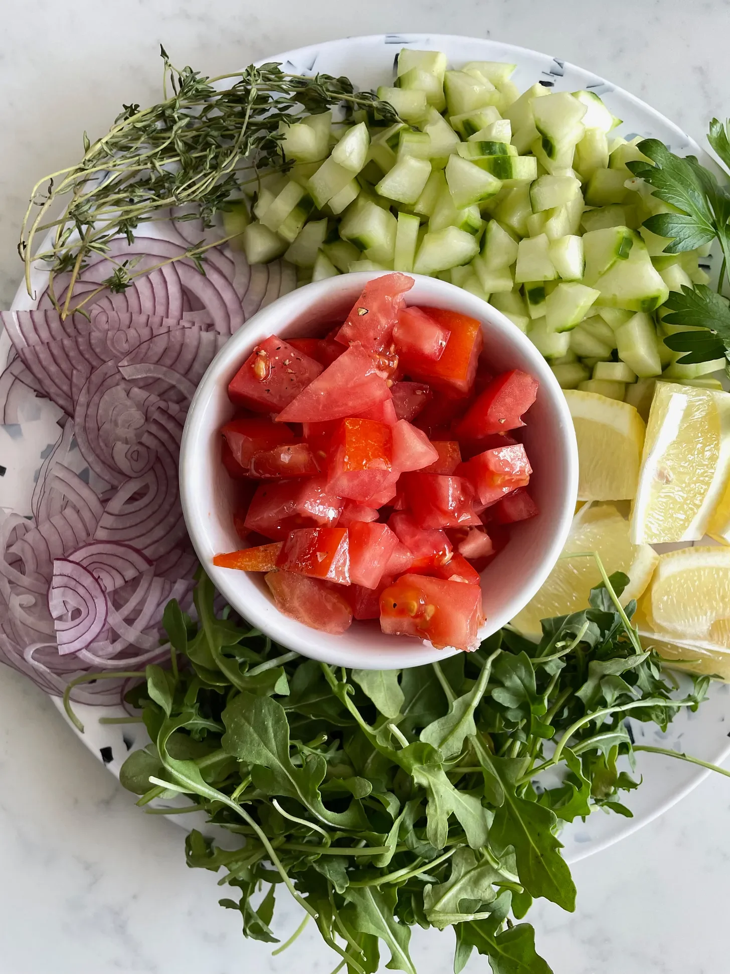 arugula, lemon wedges, tomato, cucumber, thinly sliced red onion, herbs